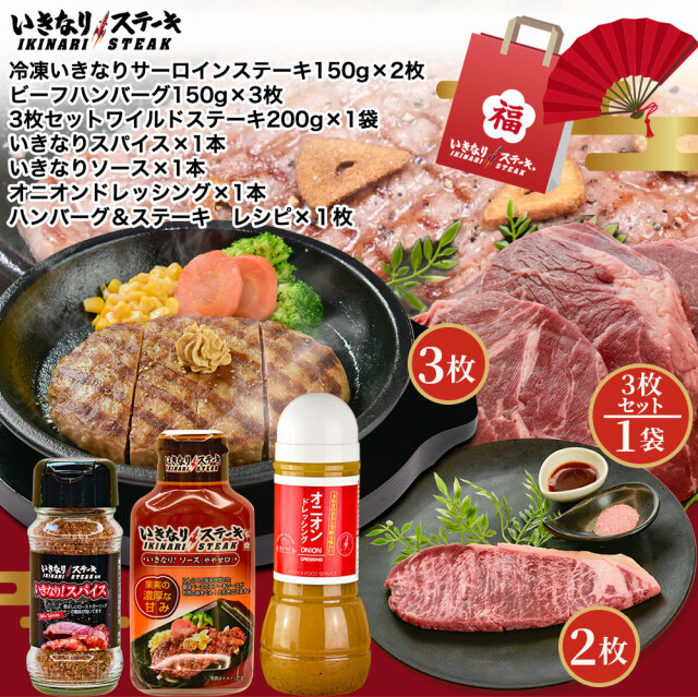 冷凍いきなり!ビーフハンバーグ150g×3 冷凍いきなり!サーロインステーキ150g×2 冷凍いきなり!ワイルドステーキ 約200g×3 いきなり!スパイス85g×1 いきなりステーキ!ソース(やや甘口)195g×1 オニオンドレッシング 300ml×1 |