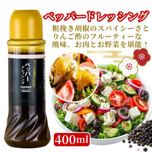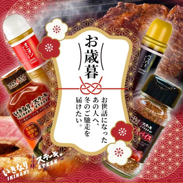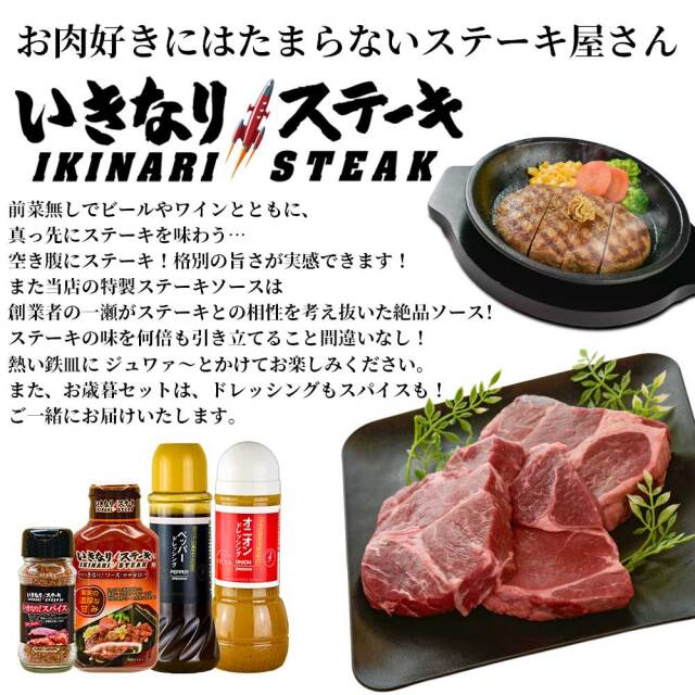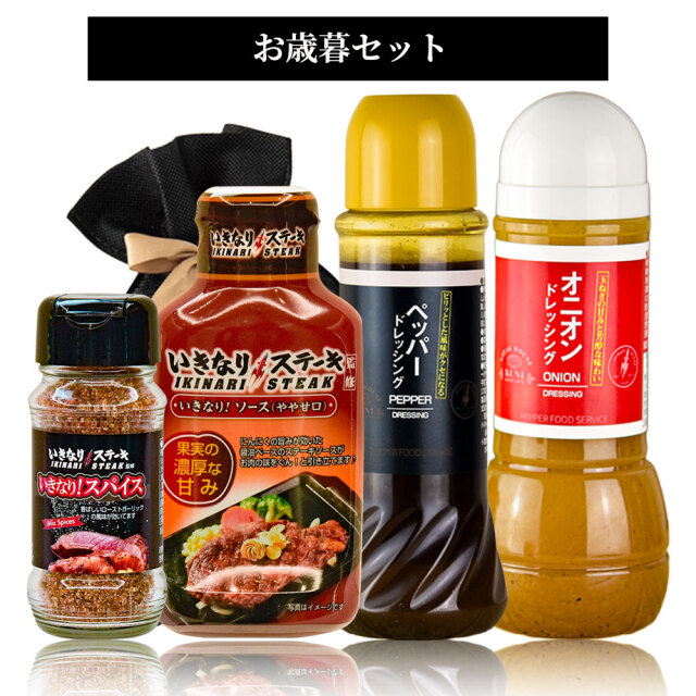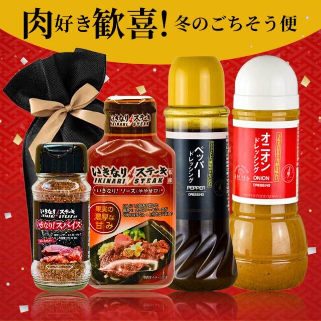 いきなり!スパイス85g×1 いきなりステーキ!ソース(やや甘口)195g×1 オニオンドレッシング300ml×1本 ペッパードレッシング400ml×1本 |