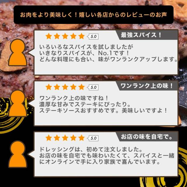 いきなり!スパイス85g×1 いきなりステーキ!ソース(やや甘口)195g×1 オニオンドレッシング300ml1本 ペッパードレッシング400ml1本 |